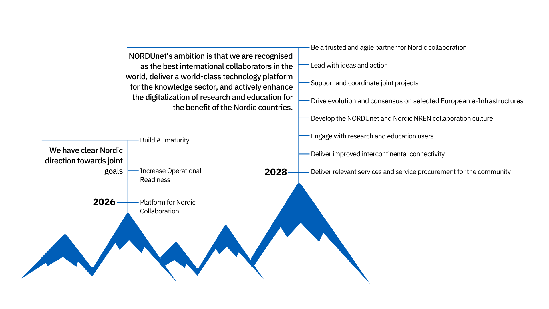 Platform for Nordic Collaboration to facilitate joint value creation: NORDUnet is a vehicle for joint action by the Nordic NRENs. In 2026 we will continue to facilitate NREN collaboration. NORDUnet and the NREN’s will explore working closer together on service and network operations than today. Development of infrastructure for new network applications could be accelerated through Nordic collaboration. We will all benefit from joint direction in network design and engineering. The Nordic NRENs should prospect working together in new and broader areas. We will probe these and other areas of collaboration, experiment with suitable collaboration models, and expand the ways NORDUnet can create value by leveraging Nordic strengths
