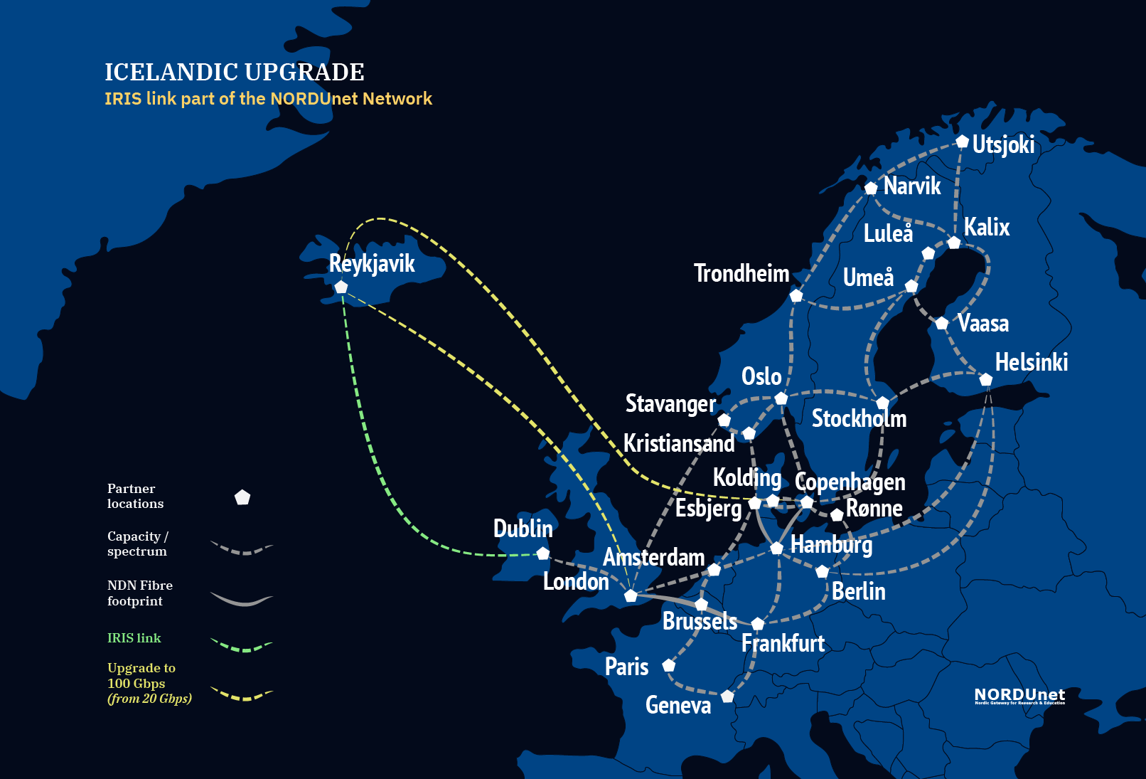 Through the lease of a dedicated circuit at the newly established IRIS subsea cable connection from Ireland to Iceland, RHnet and NORDUnet will provide the Icelandic research and education sector with both additional capacity and redundancy. Coinciding with the inauguration of the new circuit, the two existing NORDUnet connections to Iceland are being upgraded.